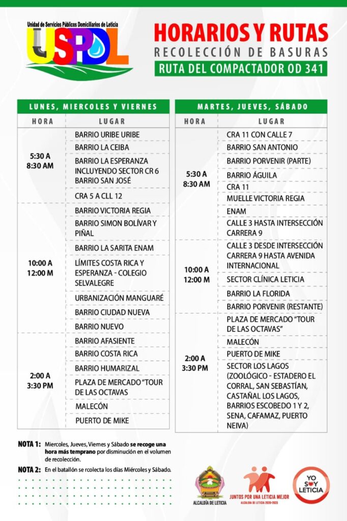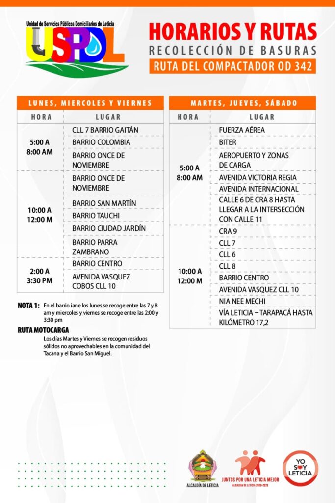 Desde la Unidad de Servicios Públicos Domiciliarios de Leticia agradecemos el manejo adecuado de basuras por parte de nuestros usuarios, para así evitar el calapso de residuos o que estos sean esparcidos por las calles a causa de animales.