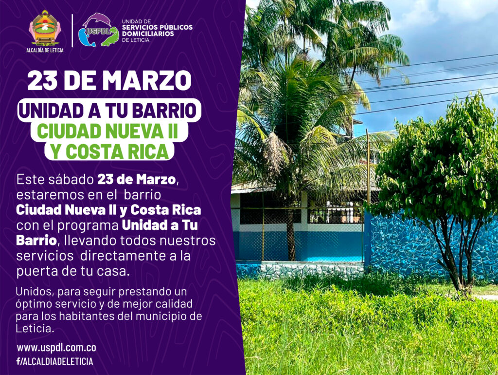 Atención, vecinos del barrio Ciudad Nueva II y Costa Rica, este sábado 23 de marzo, la Unidad de Servicios Públicos Domiciliarios de Leticia #USPDL estará presente con nuestro programa “Unidad a tu Barrio”. 🏘️✅💜